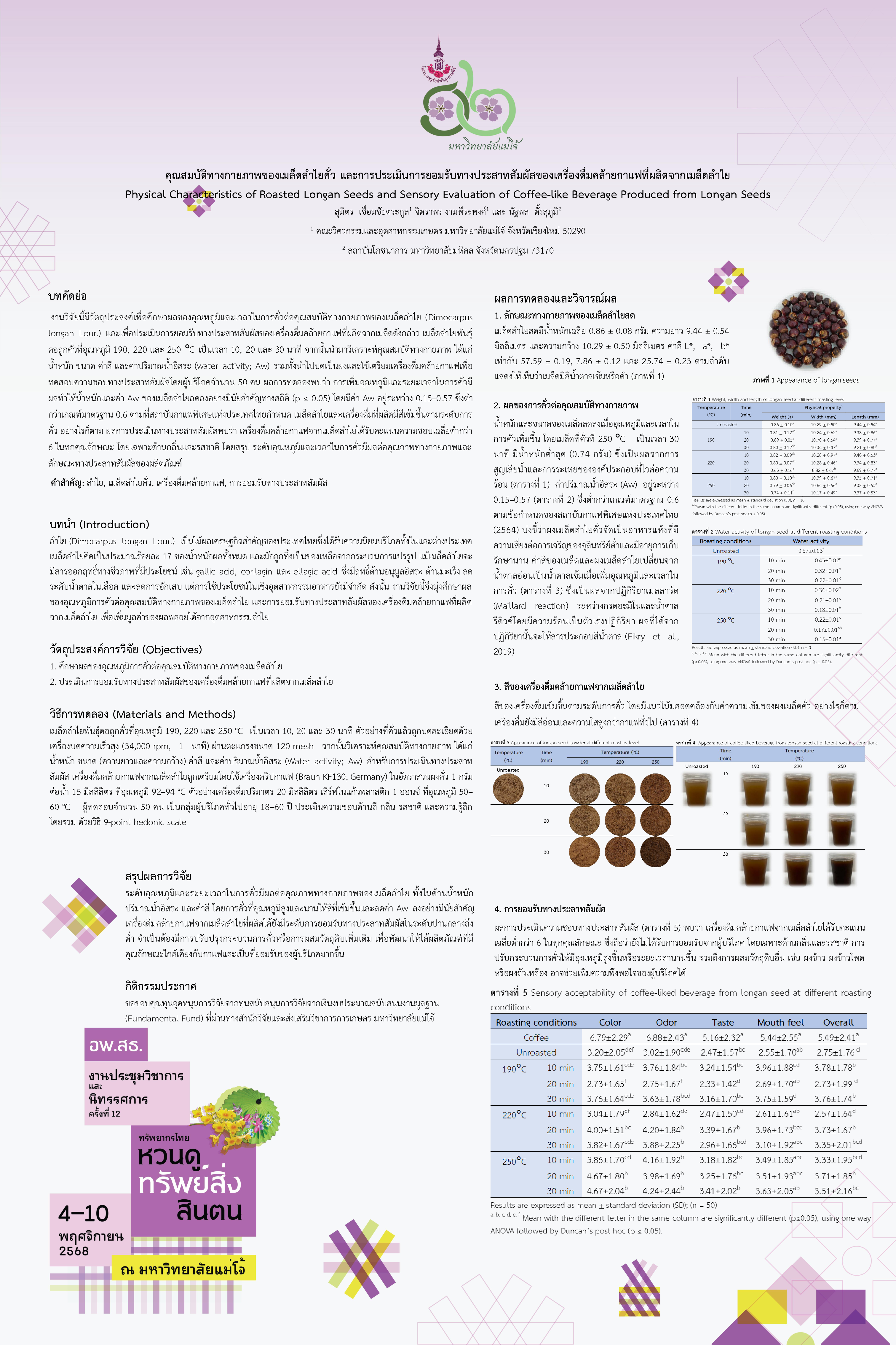คุณสมบัติทางกายภาพของเมล็ดลำไยคั่ว และการประเมินการยอมรับทางประสาทสัมผัสของเครื่องดื่มคล้ายกาแฟที่ผลิตจากเมล็ดลำไย