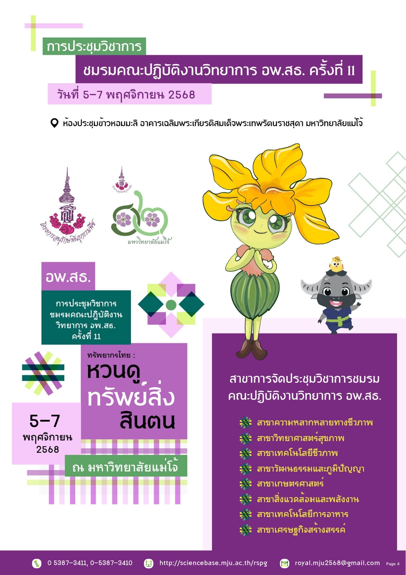มหาวิทยาลัยแม่โจ้ ขอเชิญเข้าร่วม "ประชุมวิชาการชมรมคณะปฏิบัติงานวิทยาการ อพ.สธ. ครั้งที่ 11" ระหว่างวันที่ 5-7 พฤศจิกายน 2568 ณ ห้องประชุมข้าวหอมมะลิ อาคารเฉลิมพระเกียรติสมเด็จพระเทพรัตนราชสุดา มหาวิทยาลัยแม่โจ้ จังหวัดเชียงใหม่