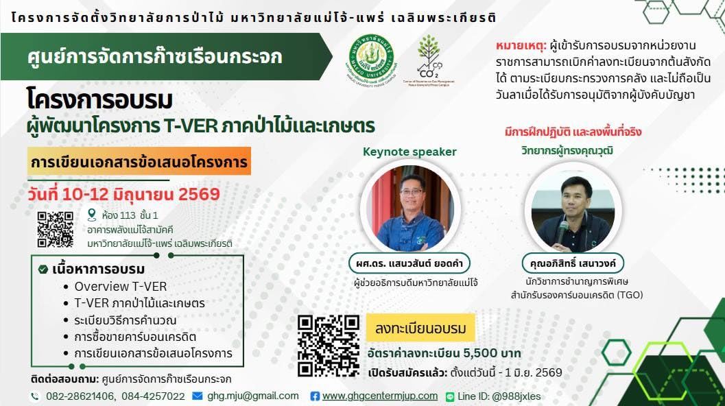 ประกาศ !!! ศูนย์การจัดการก๊าซเรือนกระจก โครงการจัดตั้งวิทยาลัยการป่าไม้ มหาวิทยาลัยแม่โจ้-แพร่ เฉลิมพระเกียรติ จัดโครงการอบรมคาร์บอนเครดิตภาคป่าไม้และเกษตร "ผู้พัฒนาโครงการ T-VER ภาคป่าไม้ รุ่นที่ 2"